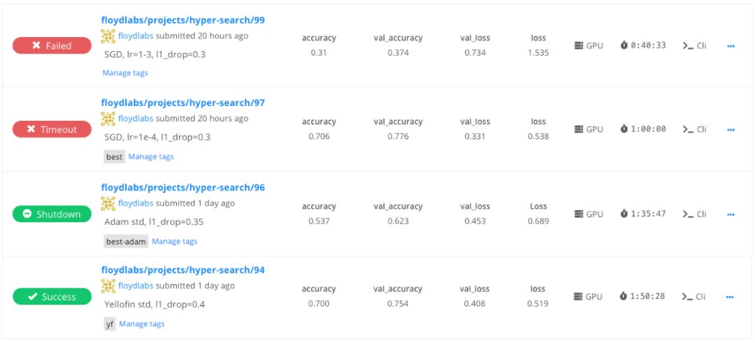 下图显示了FloydHub项目中的任务列表。可以看到,该用户正在使用任务消息,突出显示在这些任务中使用的超参数。