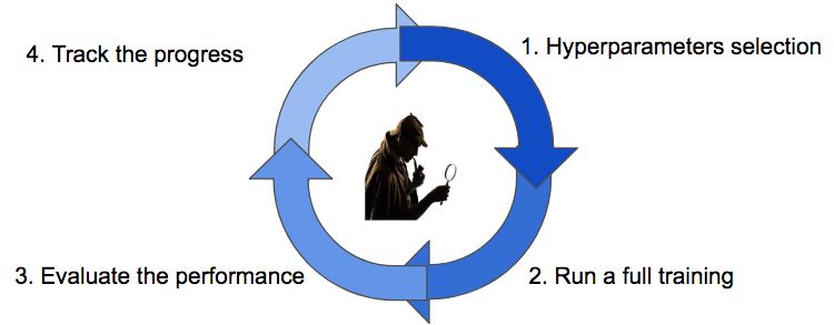 流程非常简单:比如学生设计了一个实验后,遵循学习过程的所有步骤(从数据收集到特征图映射的可视化),然后在超参数上依次迭代直到时间终止。