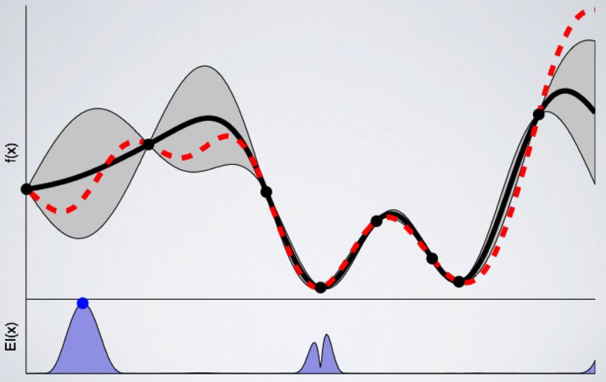 在这个例子中,如果我们使用不确定性区域中的配置,则函数将寻找尽可能低的值。上图中的蓝点显示了下一次训练所选择的点。