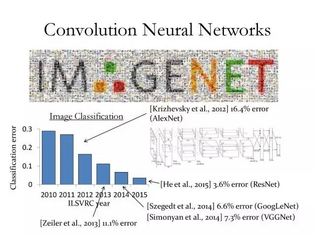 这是深度学习从2012年开始到现在的发展。从ImageNet上的一些结果,可以看得出来这些年深度学习发展的速度非常快。