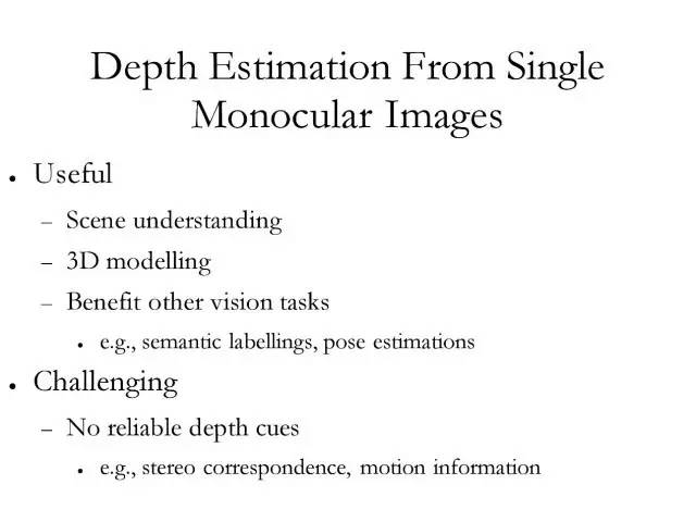 直接从单幅图像中估计出深度信息本身是一个非常有用的,当然也是非常困难的问题。这里给出了一些可能的应用场景和挑战。