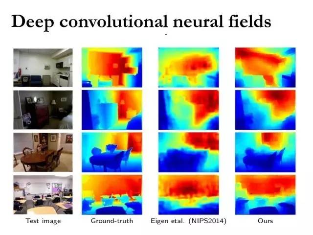 上图实验结果中,中间一栏为真实图像是用激光扫描得到的。右边一栏是我们算法的输出,不同的颜色表征不同的距离。