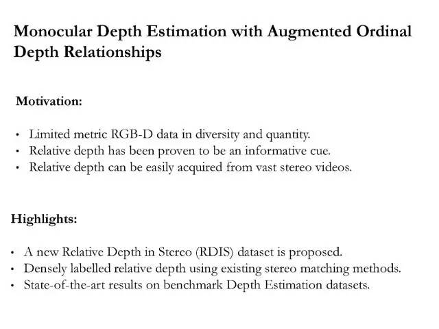 鉴于现有深度估计的数据集规模太小,我们最近为深度估计问题做了一个数据集(RDIS)。去年NIPS上有一篇论文“depth in the wild”。他们用人工标注了一个大概有几十万数据的一个大数据集,但是那个数据集最大的问题是:每一张图片只标记了两个像素。只标出了一对像素深度之间的关系,所以我们做了一个更大的数据集,每一张图片也不只标了一对像素,而是几千对像素。