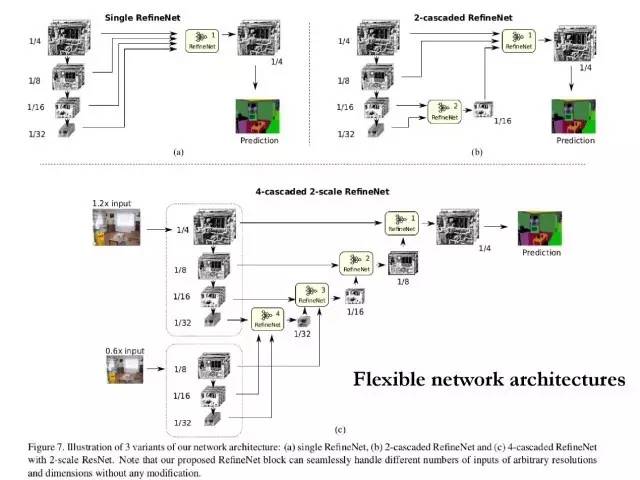 RefineNet以递归方式用细粒度的低级特征提炼低分辨率的(粗糙的)语义特征,这用来生成高分辨率的语义特征图。我们的模型是灵活的,因为它可以级联并且以多种方式修改。