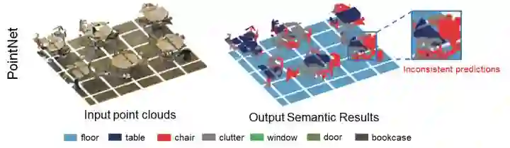 带着这样的疑问,我们对PointNet在S3DIS数据集Area 5上的分割结果进行了可视化。如上图highlight的区域所示,PointNet错误地将一张桌子的左半部分识别为桌子,而将右半部分识别为椅子。造成这样明显不一致结果的原因是什么呢?可以看到,这张桌子在预处理切块(左图)的时候就已经被切分成几个小的点云块,而后再分别不相关地地输入到网络中。也就是说,在点云目标几何结构已经被切块所破坏的前提下,网络是难以有效地学习到桌子的整体几何结构的。