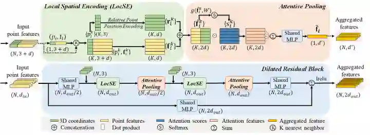 为了缓解这个问题,我们进一步提出了与随机采样互补的局部特征聚合模块(Local feature aggregation)。如图所示,该模块主要包括三个子模块:1)局部空间编码(LocSE), 2) attentive pooling, 3)扩张残差块(dilated residual block)。