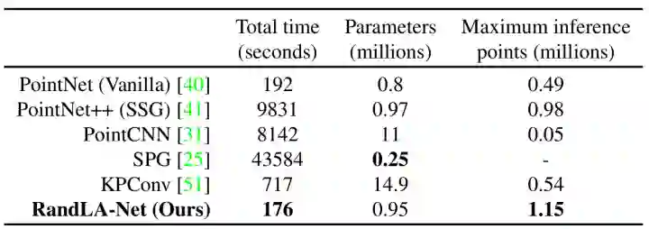 我们进一步对RandLA-Net在处理真实场景中的大规模三维点云的效率进行评估。具体来说,我们选择在SemanticKITTI数据集的验证集(序列8:一共4071帧)进行对比测试。主要评估以下三个方面的指标:总时间,模型参数以及网络最多可处理点数。公平起见,我们在每一帧中将相同数量的点(81920)输入到baseline以及我们RandLA-Net中。实验结果如下表所示,可以看出: