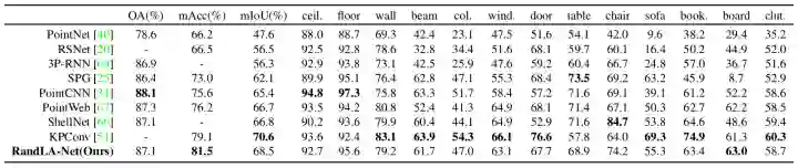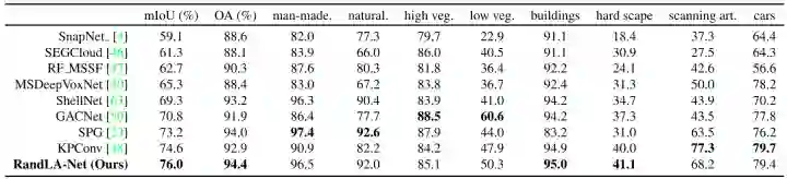 Semantic3D由30个大规模的户外场景点云组成,包含真实三维空间中160×240×30米的场景,总量高达40亿个点。其中每个点包含3D坐标、RGB信息以及强度信息。RandLA-Net只用了三维坐标以及对应的颜色信息进行处理。从表中可以看出我们的方法达到了非常好的效果,相比于SPG, KPConv等方法都有较明显的提升。