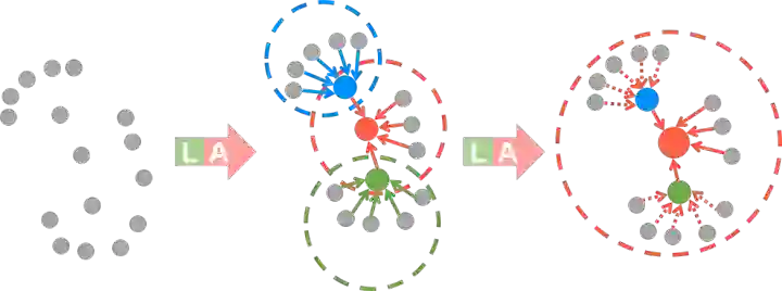 图 5. 扩展残差块(Dilated residual block)增加每个点的感受野(虚线圈)的过程示意图。彩色点代表聚集后的特征。L: Local Spatial Encoding, A: Attentive Pooling.