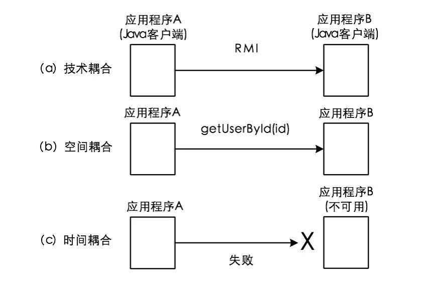从软件设计上讲存在三种不同层级的耦合度,即技术耦合、空间耦合和时间耦合。技术耦合度表现在服务提供者与服务消费者之间需要使用同一种技术实现方式。如图1-6a中服务提供者与服务消费者都使用RMI(Remote Method Invocation)作为通信的基本技术,而RMI是Java领域特有的技术,也就意味着其他服务消费者想要使用该服务也只能采用Java作为它的基本开发语言;空间耦合度指的是服务提供者与服务消费者都需要使用统一的方法签名才能相互协作,图1-6b中的getUserById(id)方法名称和参数的定义就是这种耦合的具体体现;而时间耦合度则表现在服务提供者与服务消费者只有同时在线才能完成一个完整的服务调用过程,如果出现图1-6c中所示的服务提供者不可用的情况,显然,服务消费者调用该服务就会发生失败。
