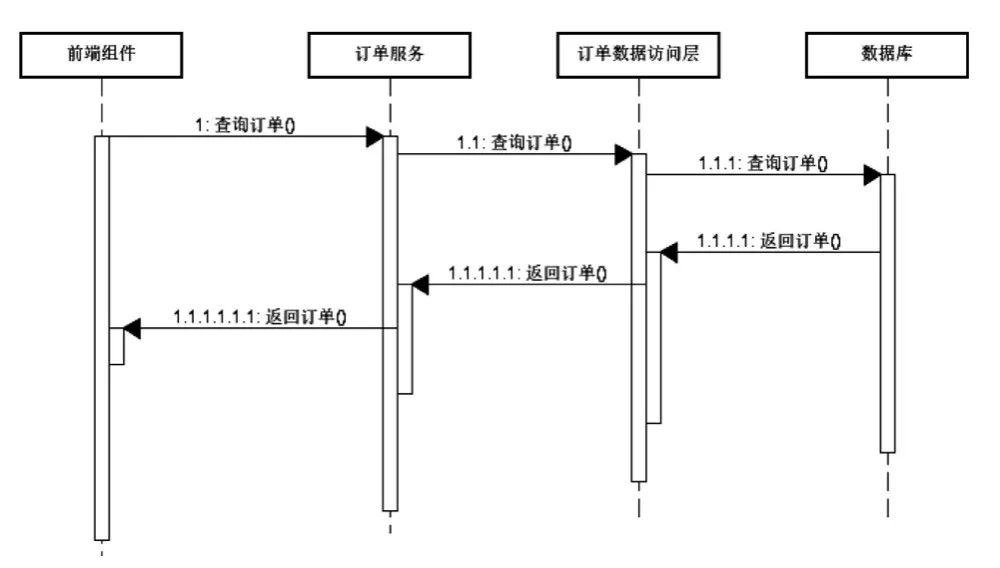 在典型的三层架构中,图1-1展示了基于传统实现方法的订单查询场景时序图。一般用户会使用前端组件所提供的操作入口进行订单查询,然后该操作入口会调用后台系统的服务层,服务层再调用数据访问层,进而访问数据库,数据从数据库中获取之后逐层返回,最后显示在包括前端服务或用户操作界面在内的前端组件上。