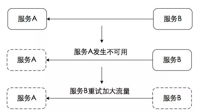 在微服务架构中,我们经常会提到雪崩效应(Avalanche Effect)这一概念。服务雪崩的产生是一种扩散效应。当系统中存在两个服务A和B,如果A服务出现问题,而B服务会通过用户不断提交服务请求等手工重试或代码逻辑自动重试等手段进一步加大对A服务的访问流量。因为B服务使用同步调用,会产生大量的等待线程占用系统资源。一旦线程资源被耗尽,B服务提供的服务本身也将处于不可用状态,整个过程的演变可参考图1-5。而这一效果在整个服务访问链路上进行扩散,就形成了雪崩效应。