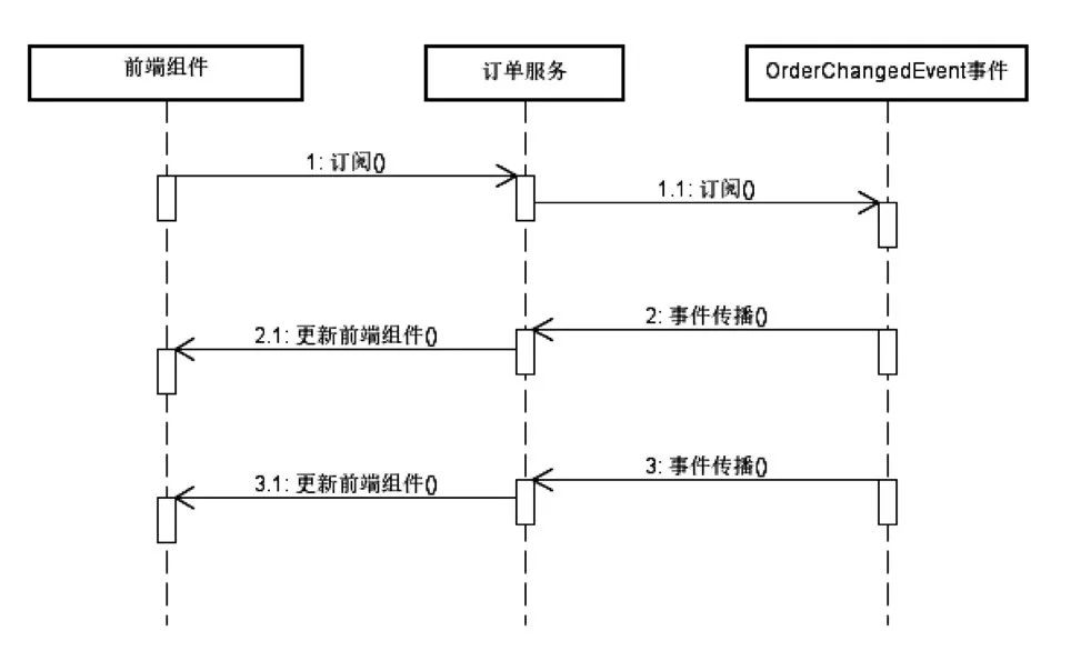 在图1-2中,我们并不是直接访问数据库来获取数据,而是订阅了OrderChangedEvent事件。当订单数据发生任何变化时,系统就会生成这一事件,然后通过一定的方式传播出来。而订阅了该事件的服务就会捕获该事件,从而通过前端组件响应该事件。事件处理的基本步骤涉及对某个特定事件进行订阅,然后等待事件的发生。如果不需要再对该事件做出响应,我们就可以取消对事件的订阅。