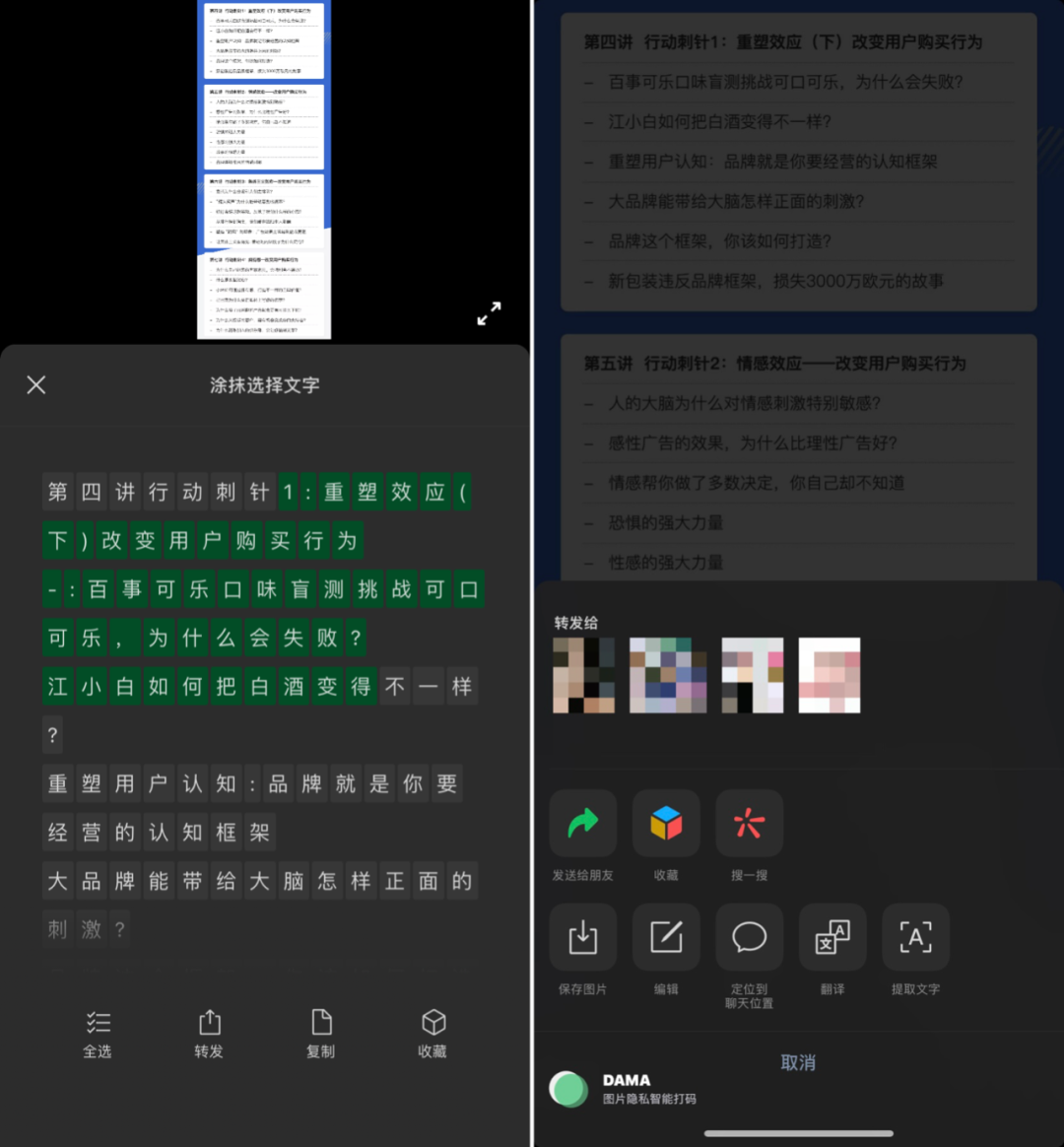 提取出的文字可以一键转发、复制和收藏。如果你对 OCR 的需求不高,不需要专门下载 OCR 工具,也可以通过微信来解决。