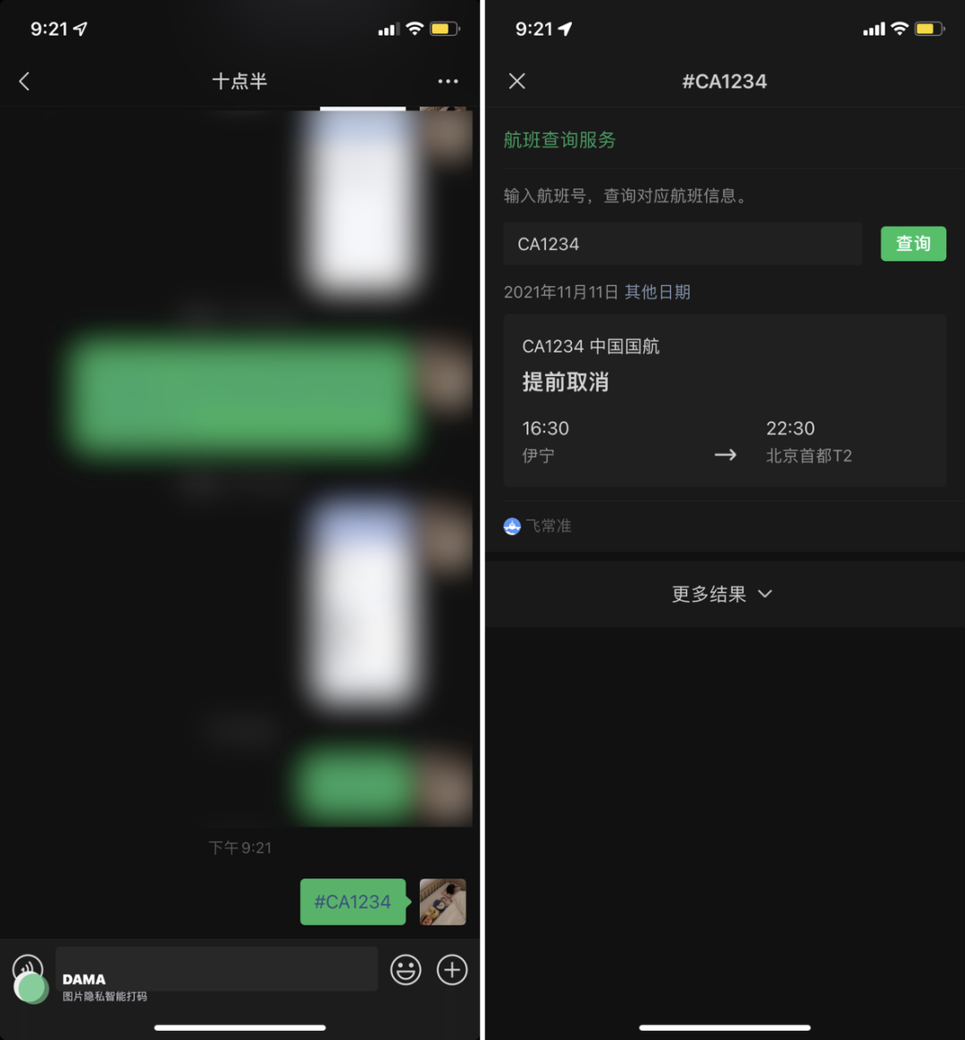 对话框中的搜索功能也十分丰富,抛开长按文字的搜一搜功能与搜索表情包的功能不提,在对话框中输入「#搜索内容」的功能算是较为隐蔽了。比如要查询航班信息,在对话框中输入#+航班号,便相当于生成了一个链接,点开则可快速查看航班信息,省去了一些搜索步骤。