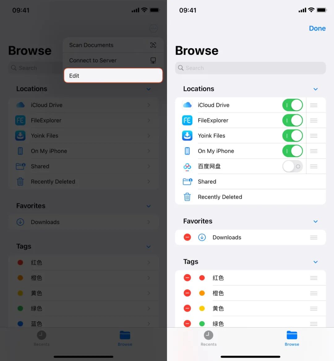 值得一提的是,iOS 上有不少应用都支持了 iCloud Drive,你可以直接在「文件」应用的「浏览」中点击右上角的菜单,并选择「编辑」,即可将支持的应用添加到 iCloud Drive。在微信中发送文件时,你也可以直接从这些应用中选择文件。