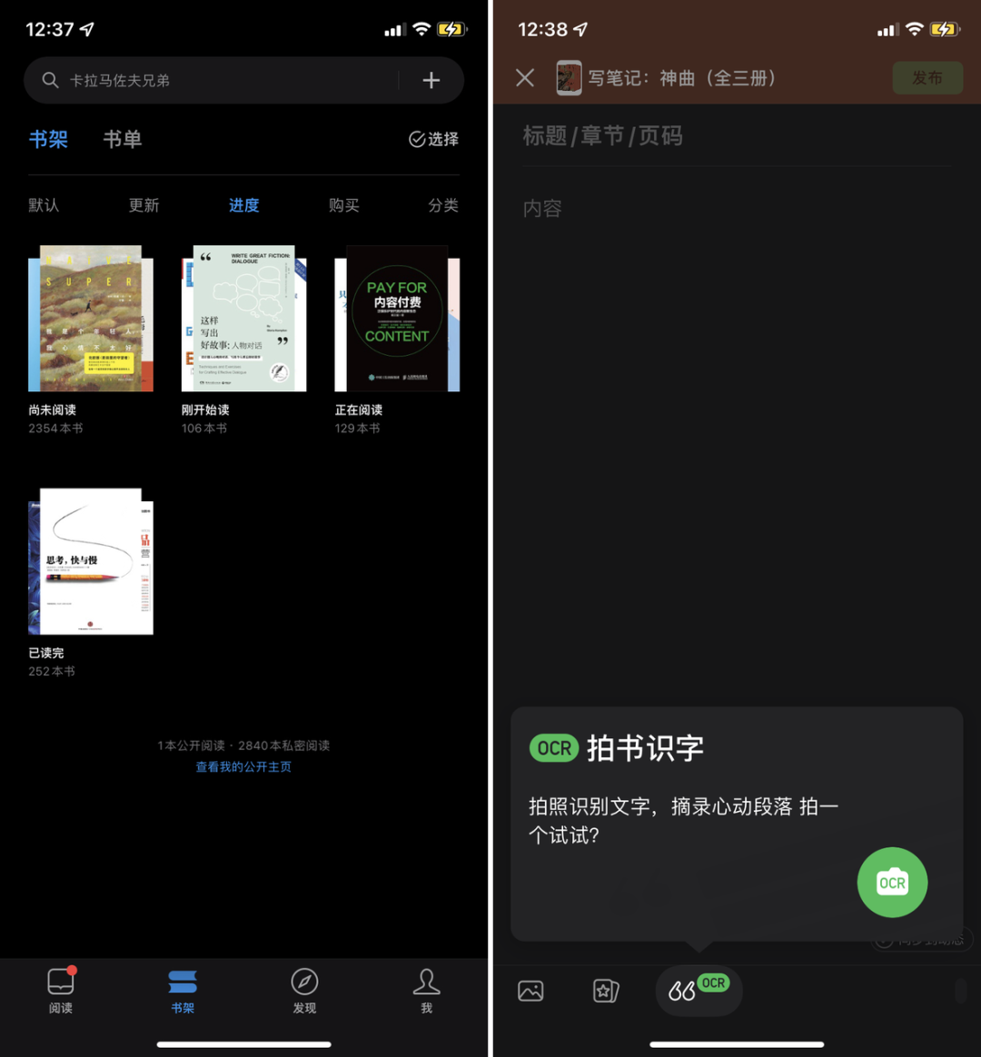 豆瓣上的读书并不只有标记进度功能,还可以将自己的读书笔记上传,我们在读书时并不一定只用电子阅读,当读纸质书时,这个功能就派上用场了,在发表笔记页面有 OCR 功能,将照片上的文字识别并上传,识别率还是很高的,还能标记页码,也省去了拍照、传到其他 OCR 软件、识别、整理、再上传的功能,且豆瓣读书的笔记功能并不像笔记软件一样占用你的存储空间,何乐而不为呢?