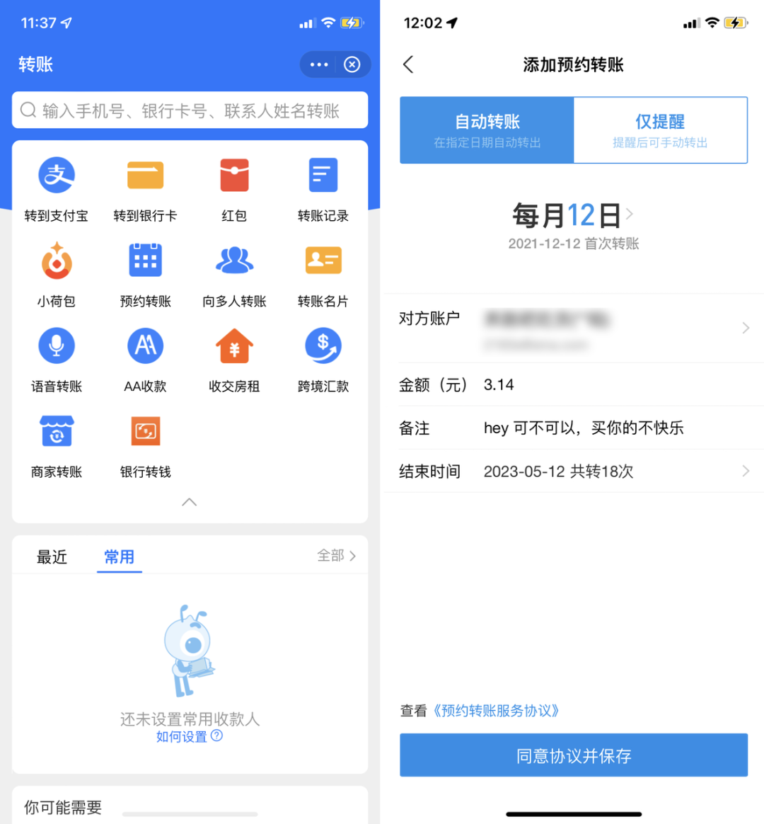 我也是偶然才发现的支付宝的预约转账功能,在转账菜单处展开,可设置对方账户、金额、备注、时间周期等信息,既可以选择支付宝到期自动转出,也可以选择到期提醒,自己手动转出操作,这个功能适合一些固定支出,比如支出房租、还车贷、转给父母或子女生活费等情况,都比较实用。