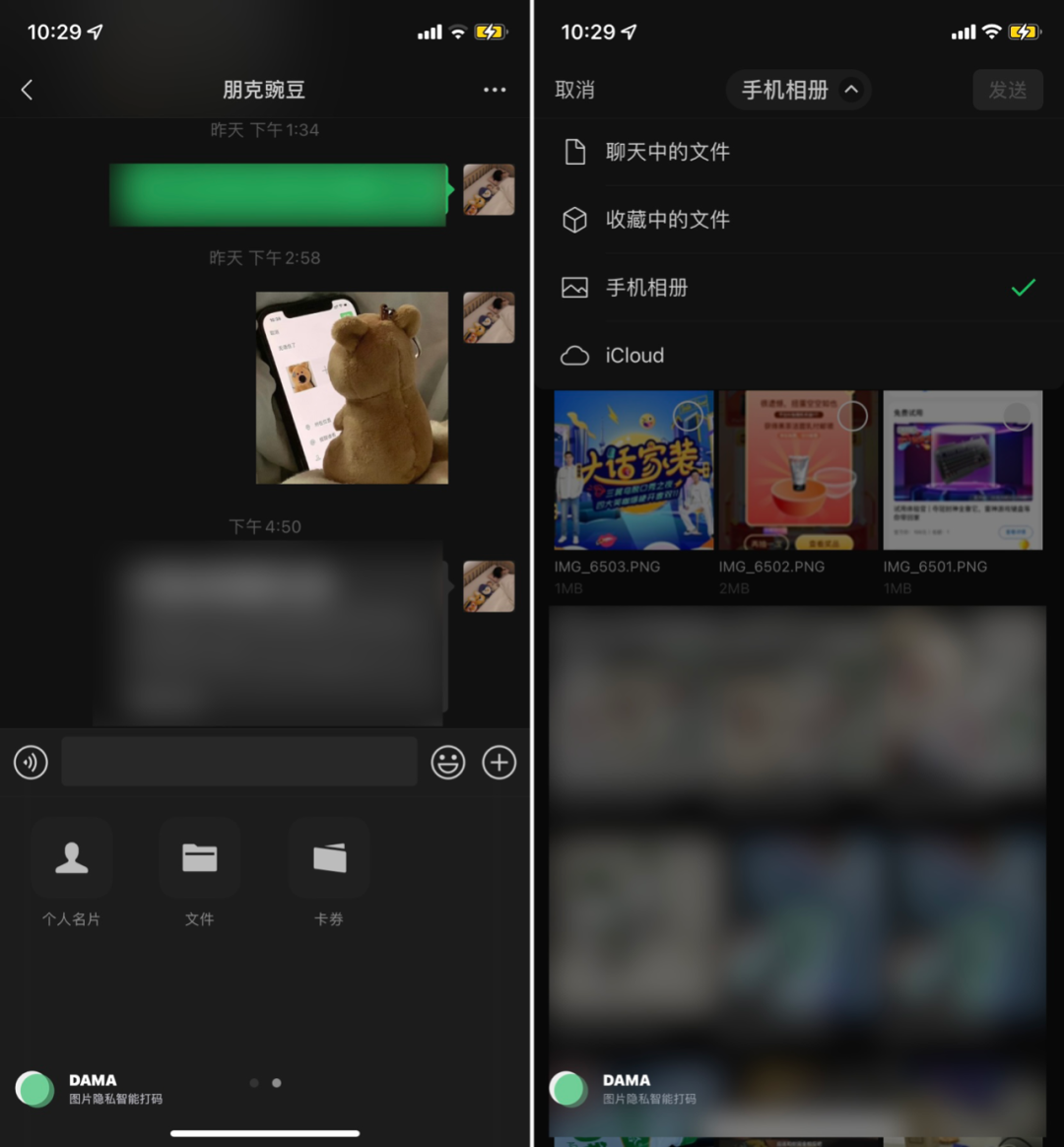 在对话框中选择下方的文件,打开后在上方切换需传输的文件的位置,可以是手机相册或者是来自云端,即可将视频直接以「文件」的格式发送,无损画质也没有大小限制。