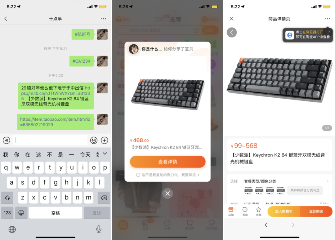 众所周知,在商品页点击分享时会生成稀奇古怪的淘口令,好友需要复制这段淘口令再跳转到淘宝打开,而且还会暴露分享人的淘宝 ID 及主页,好友点击查看详情后,两个人的淘宝主页会互相暴露。
