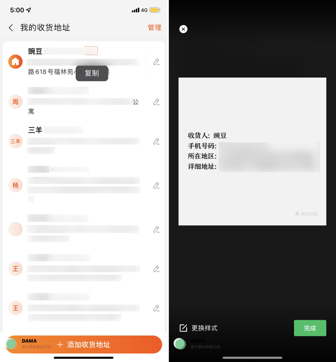 在淘宝的收货地址管理处,长按收货地址可以复制信息,粘贴板上的信息有收件人、电话号码和详细地址(格式如下图所示),跳转到其他电商、快递平台填写地址时,可以一键识别,省去自己再重新填写的时间,这个功能在搬家后换收货地址时格外有用了。