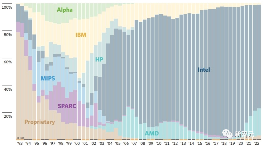 据统计,虽然本期Top500中,仅有20.2%的机器采用AMD X86处理器,75.8%的机器基于Intel X86处理器,但一半的新系统和75%的新性能——都依托于AMD的芯片。