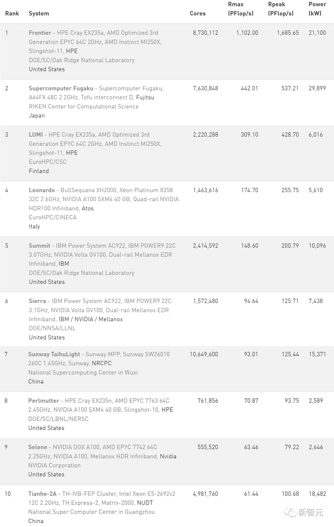 其中,Frontier使用针对HPC和AI优化的Gen AMD EPYC处理器,排名第三的LUMI系统同样如此。