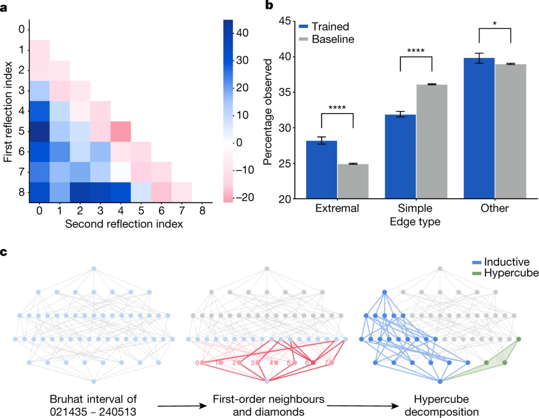 从KL多项式的定义来看,简单反射和极值反射之间的区别与子图相关性的联系是很直观的。考虑到这一现象,DeepMind发现一个Bruhat区间可以一个自然地分解为两个部分:由一组极值边诱导的超立方体和一个与SN-1中的区间同构的图。
