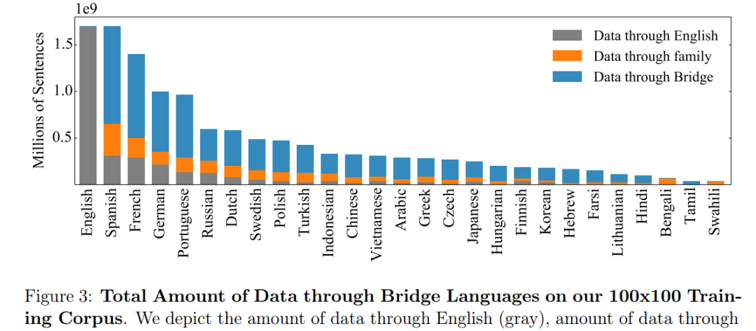 为了连通不同语系的语言,研究者确定了少量的桥梁语言(bridge language),它们通常由每个语系中的 1 至 3 种主要语言构成。如上述印度境内所使用的语言中,印地语、孟加拉语和泰米尔语是雅利安语的桥梁语言。然后,研究者挖掘这些桥梁语言所有可能组合的并行训练数据。通过这种方法,训练数据集最终生成了 75 亿个并行句子,对应 2200 个语言方向(direction)。