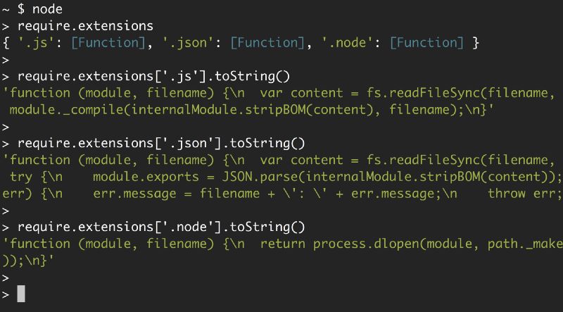 require.extensions 来查看对三种文件的支持情况: