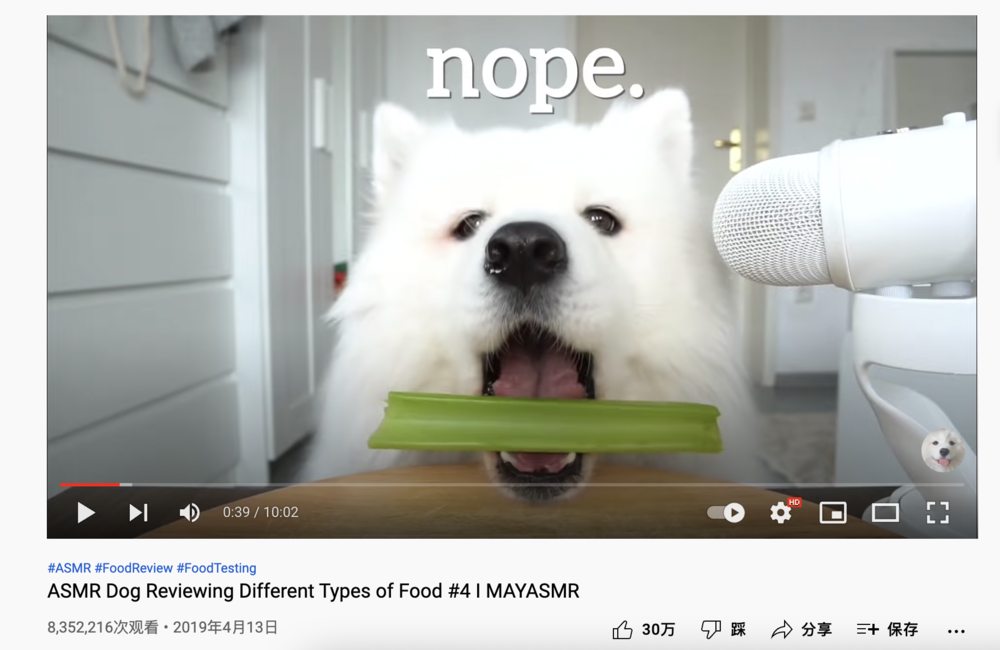 在YouTube的Dog ASMR频道,UP主会用收音设备记录宠物吃饭的声音。目的在于吃,而不是演。