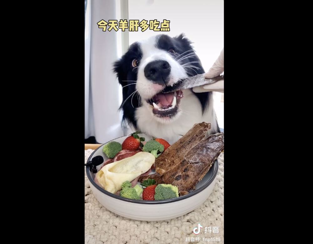 国内类似视频也倾向于展示给宠物科学配餐的过程,一顿饭里会出现许多不同种类的冻干、生骨肉,以及佐餐的蔬菜水果零食。