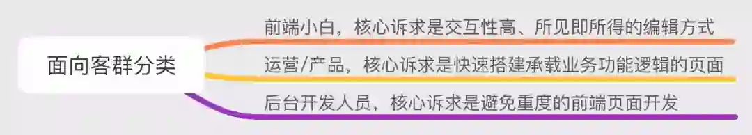 页面可视化搭建工具的面向客群是指工具的的使用客群. 不同的使用客群, 其对页面技术的认知程度、搭建页面的诉求有所不同, 所以可以从工具的面向客群来区分不同工具.