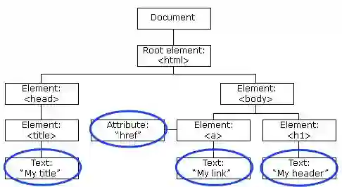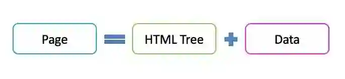 从前端开发的角度, 可以认为页面是由 HTMLTree 和 Data 组成, HTMLTree 是页面元素的树形结构, Data 是页面元素的属性或文本节点. 下图中蓝色框所示的节点可以认为是数据.