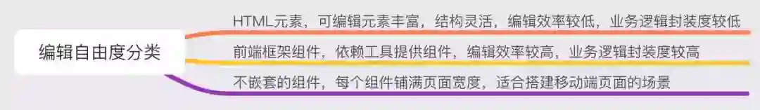 编辑自由度为 HTML 元素的页面搭建工具有以下特点: 可编辑的元素丰富、页面结构灵活、可视化编辑效率较低、业务逻辑封装度较低. 这类工具的可编辑单元为 HTML 元素, 可以编辑元素的文本、样式和行为, 可编辑的元素较丰富; 并且可以组合各种 HTML 元素到页面中, 生成的页面结构灵活; 从生成页面的角度, 编辑出一个页面需要从基本的 HTML 元素开始搭建, 可视化编辑的工作量较大; 一个业务功能的实现, 通常需要渲染多个 HTML 元素, 而这类工具可以自由增删业务所需的 HTML 元素, 这导致无法固定地承载业务功能, 所以这类编辑工具生成的页面, 业务逻辑封装程度较低.