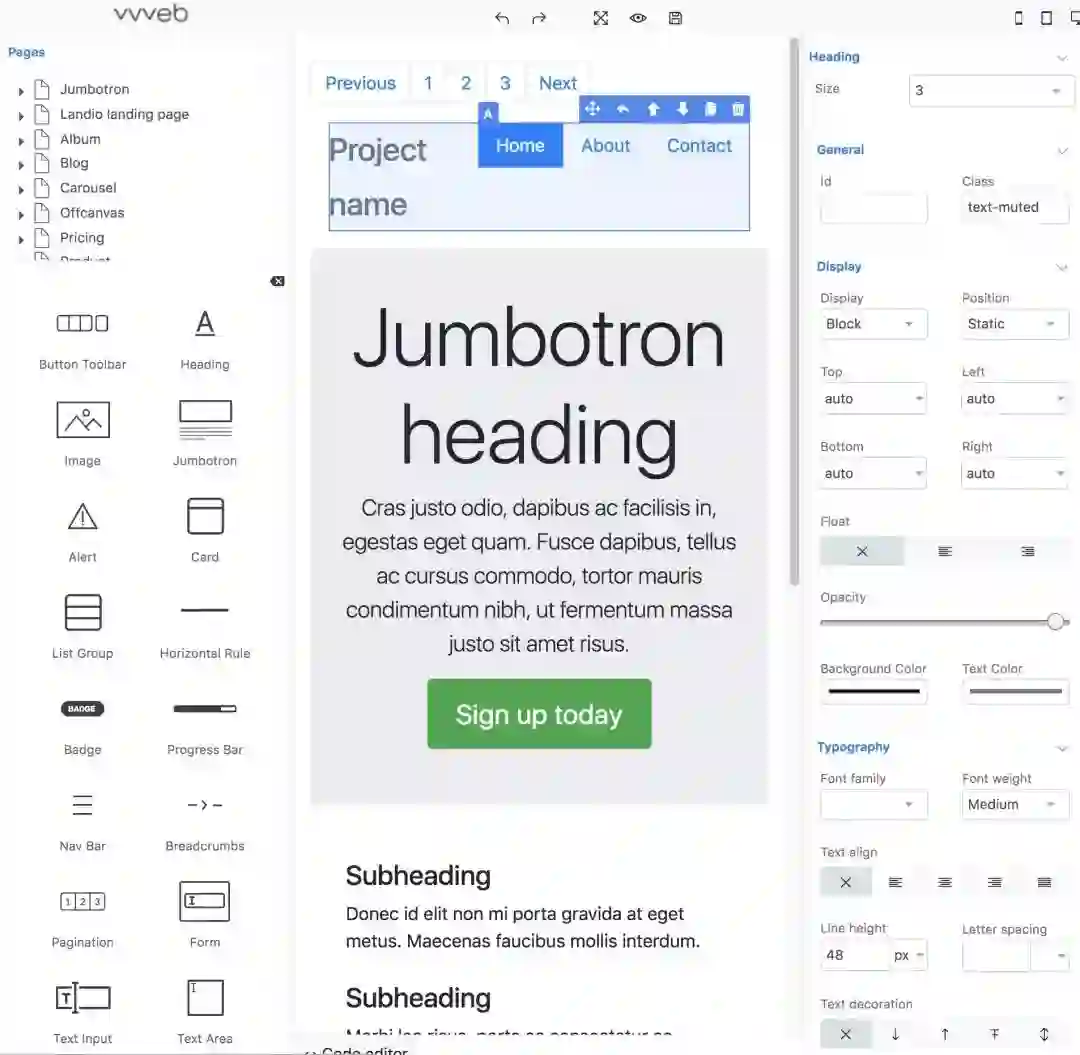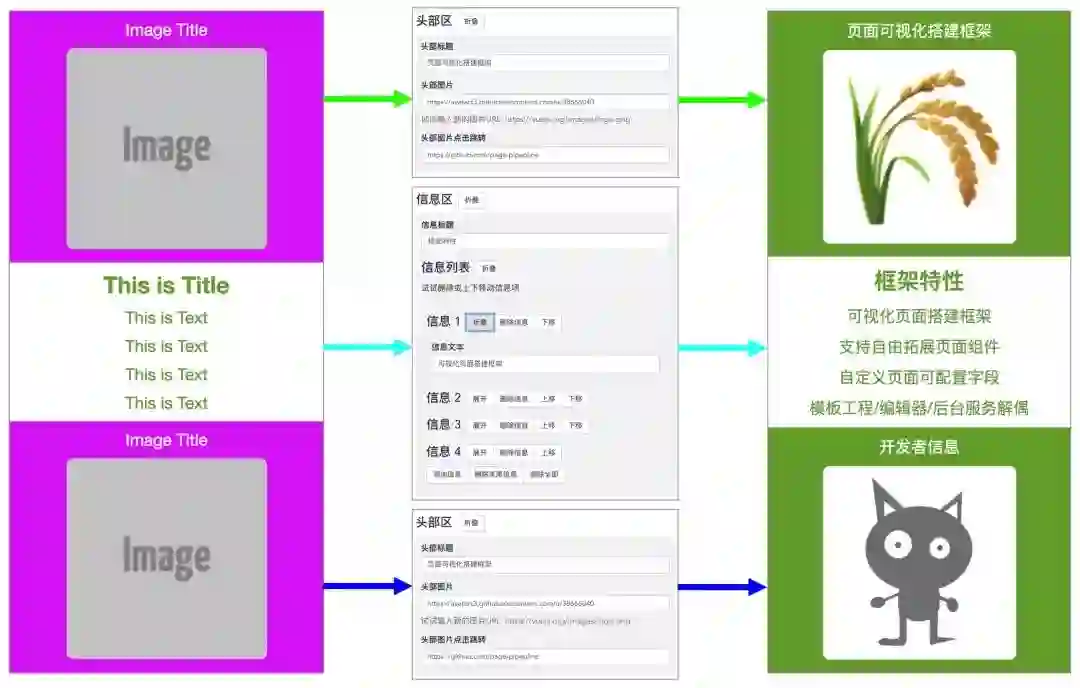 编辑系统和组件解偶,组件只需要遵循编辑系统的组织约定, 其具体开发过程和承载的逻辑与编辑系统无关, 支持自由拓展页面组件. 编辑系统与模板采用的前端框架解偶, 在遵循编辑系统约定下, 可以选择不同的前端框架.