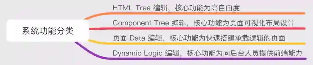 页面可视化搭建工具的系统功能是指该工具在解决特定页面可视化搭建问题上提供的核心能力. 页面是由 HTMLTree, Data 和 DynamicLogic 三部分组成, 一个页面可视化搭建工具提供的能力是编辑页面组成部分之一或多部分. 对基于组件的页面, 其可编辑单元为组件, 此时采用 ComponentTree 概念取代 HTMLTree.