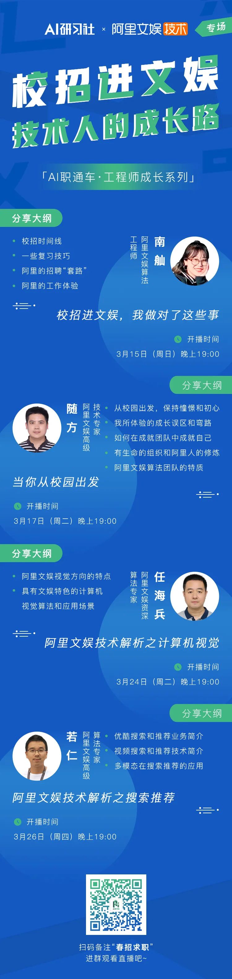 为了方便大家不错过相关直播,可以扫描下方海报二维码,添加小助手,备注“春招求职” ,直播前小助手会集中拉群,发布直播链接。此外,群内还会解锁阿里最新实用入职干货,简历直接内推,我们也将抽送AI研习社周边礼品。