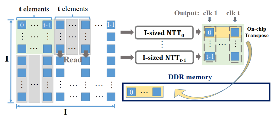 针对 POLY 部分,研究员们主要采用了 number theoretic transforms(NTT)算法进行处理(如图5)。为了处理 zk-SNARK 中 POLY 计算规模太大,从而造成 ASIC 片上计算资源及片下内存访问速度太慢的问题,研究员们设计了一种高效的流程来将大规模的 NTT 迭代分解为小规模 NTT,并使用 FIFO 等数据结构来提升内存的访问效率。除此之外,研究员们还使用了 data tiling 以及片上矩阵转置等方式来提升片下内存的效率。通过 PipeZK 系统,POLY 部分可以被加速20倍以上。