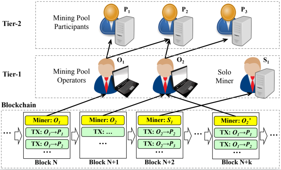 以太坊的挖矿生态结构如图2所示,区块记录矿工帐号,这些帐号来自矿池管理者或者独立矿工,他们可直接获得系统发放的挖矿奖励,当矿池收到奖励后再通过链上交易分发给矿池参与者。过去,分析算力去中心化的研究工作主要停留在分析头部矿池的算力分布,忽略了其他挖矿参与者的算力情况。因此,微软亚洲研究院的研究员们认为研究以太坊算力去中心化情况不能仅仅局限于分析挖矿节点(矿池和独立矿工)的算力分布,也应该考虑矿池参与者的挖矿行为和算力分布情况,为度量算力去中心化程度和防止算力集中的解决方案提供更多洞悉。