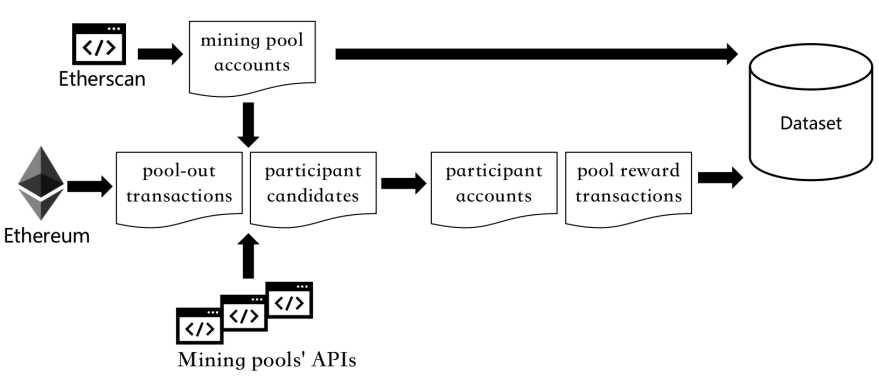由于部分矿池会在 Etherscan(以太坊搜索引擎)公开帐号信息,部分大型矿池也会给挖矿参与者提供查询挖矿收益信息的 API,以用于识别某个以太坊帐号是否属于其矿池参与者。因此,研究员们可以在 Etherscan 上爬取公开身份的矿池帐号,并从以太坊区块链数据库提取识别的矿池发出的交易,收集这些交易的接收帐号,从而用于矿池 API 识别。能被矿池 API 识别的帐号就可确认为矿池参与者帐号,然后再相应地提取识别的矿池发至矿池参与者的奖励交易。
