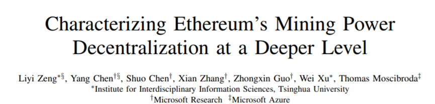 为了深入了解、分析区块链系统,微软亚洲研究院和清华大学的科研人员提出了对以太坊矿池参与者的首次大规模研究。研究员们通过数据分析了解矿池参与者的算力分布和挖矿行为,进一步刻画以太坊算力去中心化程度,并将研究的分析见解发表了论文“Characterizing Ethereum’s Mining Power Decentralization at a Deeper Level”。该工作已被全球计算机网络领域的重要会议 INFOCOM 2021 接收。