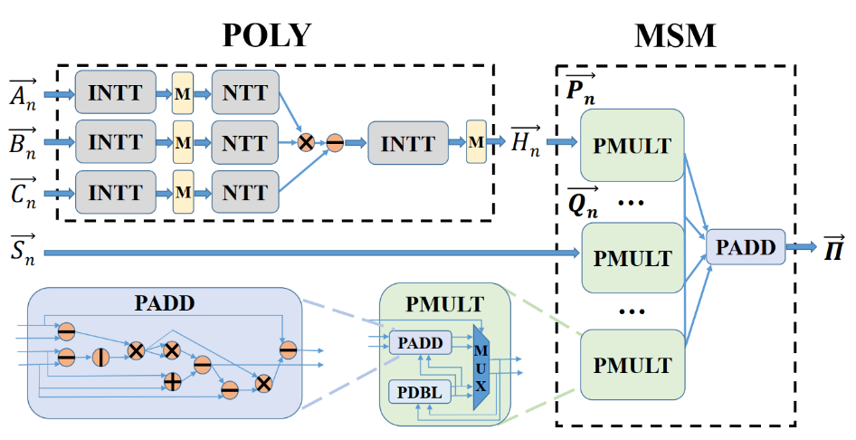zk-SNARK 协议是近年来最流行且最高效的零知识证明协议之一,其证明过程主要由两部分计算构成(如图4):一个是高次多项式的乘法(下文简称 POLY),一个是大规模的椭圆曲线向量积(下文简称 MSM)。通过深入研究,研究员们发现这两部分都可以用一种高效的流水线(Pipeline)方式进行并行加速,让 ASIC(application-specific integrated circuit,专用集成电路)的计算资源高效化并能协同 CPU 处理这两部分的计算。