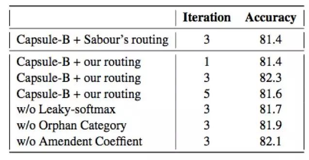 3. 路由参数修正:传统的路由参数,通常用均与分布进行初始化,忽略了下层胶囊的概率。相反,我们把下层胶囊的概率当成路由参数的先验,改进路由过程。 在 ablation test 中,我们对改进的路由和原始路由方法进行对比,如下: