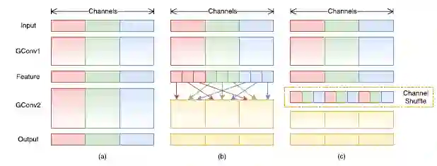 受ResNeXt的启发,作者提出使用分组逐点卷积(group pointwise convolution)来代替原来的结构。通过将卷积运算的输入限制在每个组内,模型的计算量取得了显著的下降。然而这样做也带来了明显的问题:在多层逐点卷积堆叠时,模型的信息流被分割在各个组内,组与组之间没有信息交换(如图 1(a)所示)。这将可能影响到模型的表示能力和识别精度。