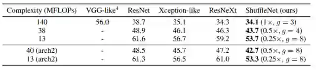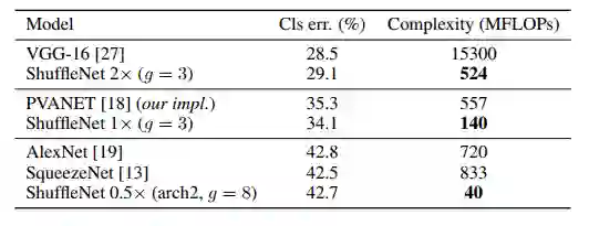 作者使用一样的整体网络布局,在保持计算复杂度的同时将ShuffleNet结构单元分别替换为VGG-like、ResNet、Xception-like和ResNeXt中的结构单元,使用完全一样训练方法。表2中的结果显示在不同的计算复杂度下,ShuffleNet始终大大优于其他网络。