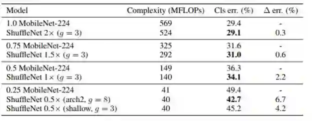 最近Howard et al. 提出了MobileNets [4],利用[1]里的逐通道卷积的设计移动设备上高效的网络结构。虽然ShuffleNet是为了小于150MFLOPs的模型设计的,在增大到MobileNet的500~600MFLOPs量级,依然优于MobileNet。而在40MFLOPs量级,ShuffleNet比MobileNet错误率低6.7%。详细结果可以从表3中得到。