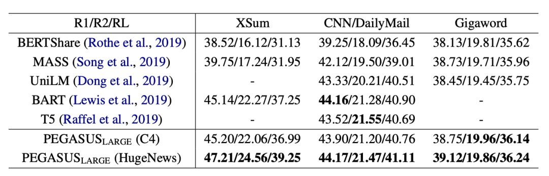 表2:PEGASUSLARGE与XSum、CNN/DailyMail和Gigaword上其他预训练模型的比较。最佳结果用粗体显示。