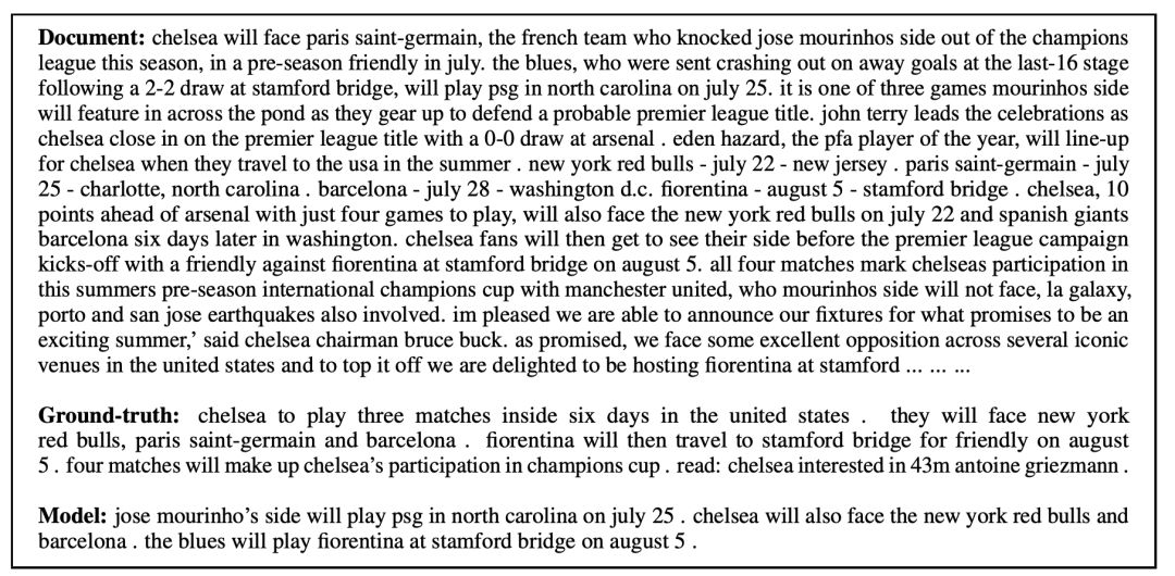 图6:PEGASUSLARGE模型对一则CNN/DailyMail文本生成的摘要,它的ROUGE2-F值相对较低,为16,但在文本质量上相当好,而且事实上也很准确。
