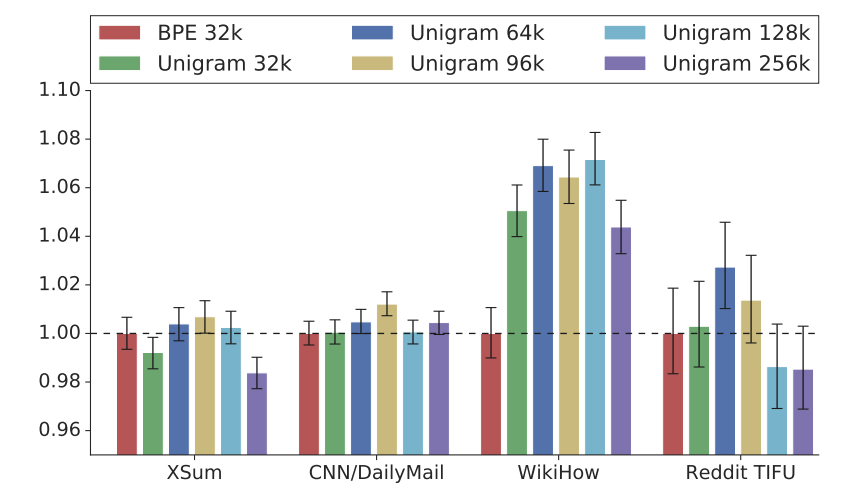 图5:PEGASUSBASE在C4 (15% GSR, Ind-Orig)上训练词汇量的效果。